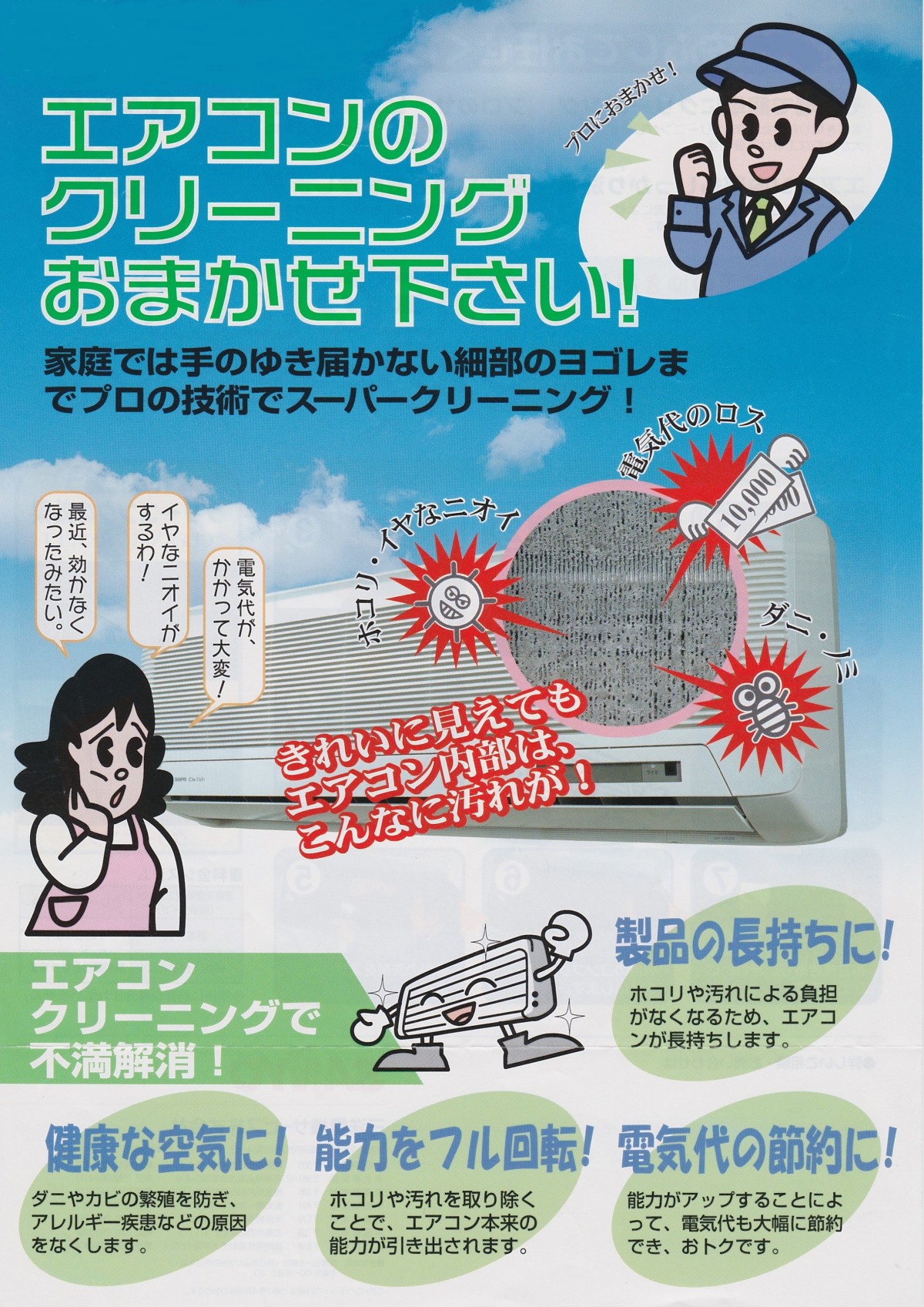 またゴミなどのつまりによる風量低下で冷房(暖房)効率が悪くなります。